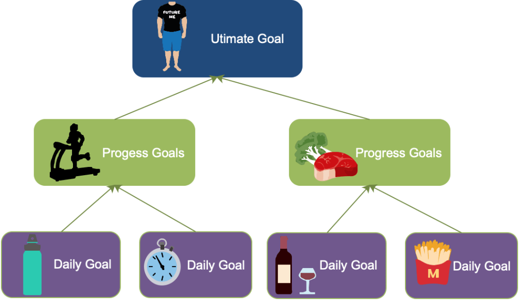 There is an old Scottish saying that look after your pennies and your pounds will look after themselves. Goal setting is somewhat similar in that it is easier to focus on the daily goals such as drink a litre of water, do 25 mins of walking, no alcohol and avoiding Junk food, etc… as shown in my example above.
