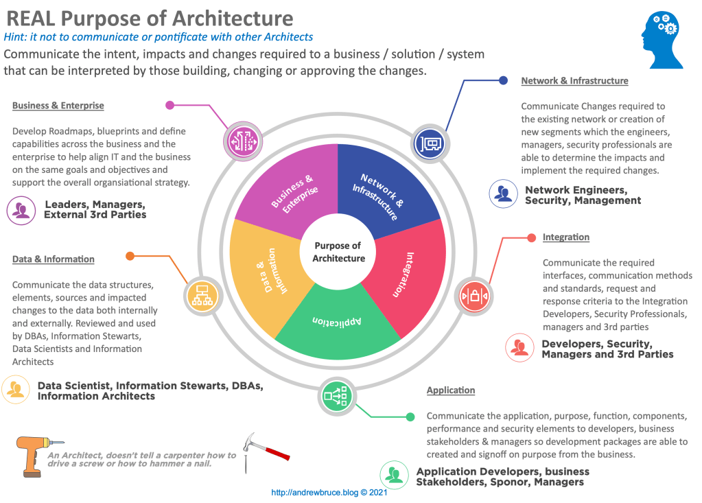 To achieve this goal, Architect’s have to focus their skills in being able to effectively communicate often complex ideas and solutions in a manner that the reader is able to understand either detailed enough for developer or an engineer to develop a work package or a sponsor to sign off that the solution addresses the intended business problem.